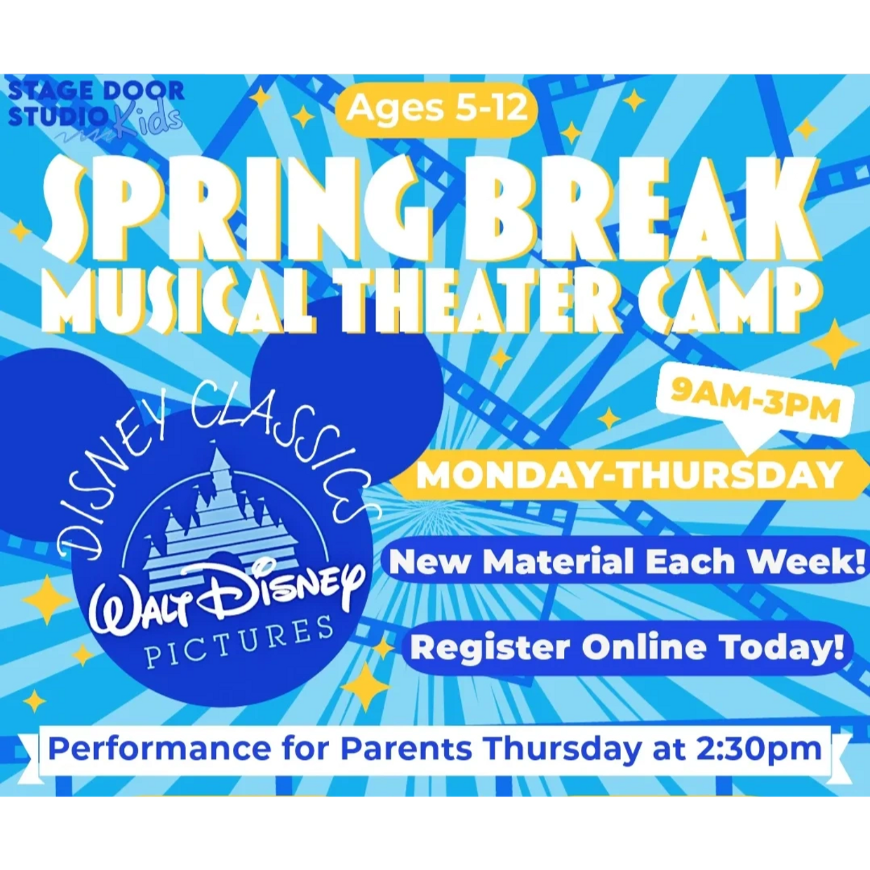 During camp, students will be learning songs/ acting scenes and dances from 3 to 4 different Disney musicals and movies!